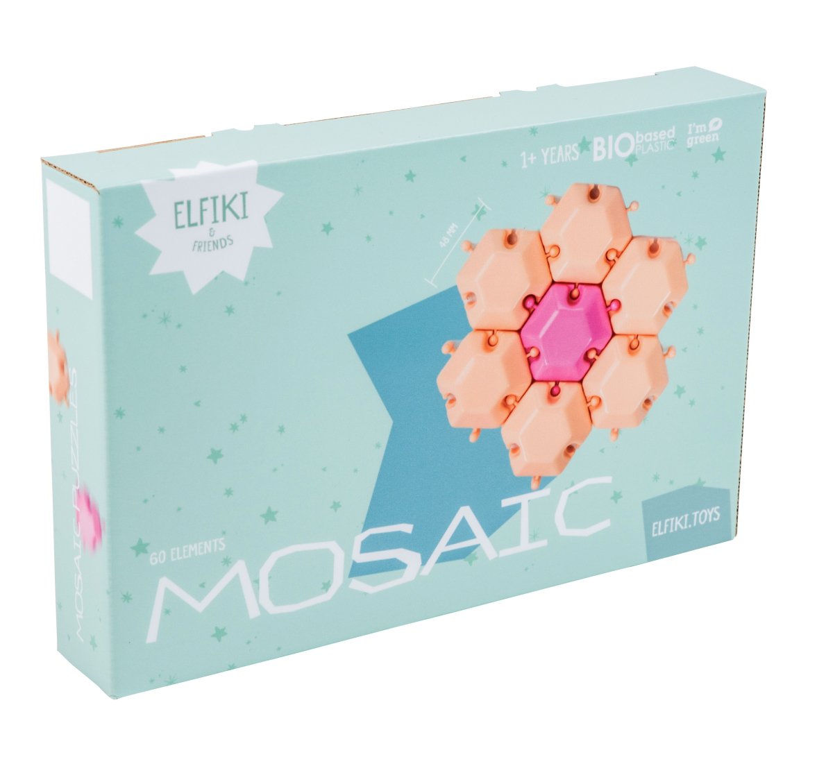 Zabawka ELFIKI Mosaic to zupełnie nowa seria ekologicznych zabawek wykonanych z bioplastiku. Bioplastik to polietylen o wysokiej gęstości, wytwarzany z trzciny cukrowej. Trzcina cukrowa jest surowcem odnawialnym, natomiast polietylen syntetyczny powstaje z paliw kopalnych, takich jak ropa naftowa i gaz ziemny. Podczas wzrostu trzcina cukrowa pochłania dwutlenek węgla z atmosfery i produkuje tlen. Dlatego stosowanie biologicznego polietylenu w ogromnym stopniu przyczynia się do redukcji emisji gazów cieplarnianych. Zabawki wykonane z bioplastiku nie ustępują pod względem właściwości zabawkom plastikowym, są równie wytrzymałe i trwałe. Razem dbajmy o środowisko! ELFIKI Mosaic to zabawka rozwijająca wyobraźnię i zdolności twórcze dziecka. Zestaw zawiera 60 jaskrawych, wielokolorowych elementów. Za pomocą specjalnego elementu dzieci mogą tworzyć różnorodne kompozycje, które powstają w ich wyobraźni: domy, drzewa, kwiaty i zwierzęta, a także modele 3D. Zabawka rozwija wyobraźnię, motorykę małą, sprawność manualną i koncentrację dziecka. Zabawki marki ELFIKI są wykonane w delikatnych, modnych kolorach, które rozwijają zmysł smaku i stylu dziecka. Opakowanie – kartonik.
