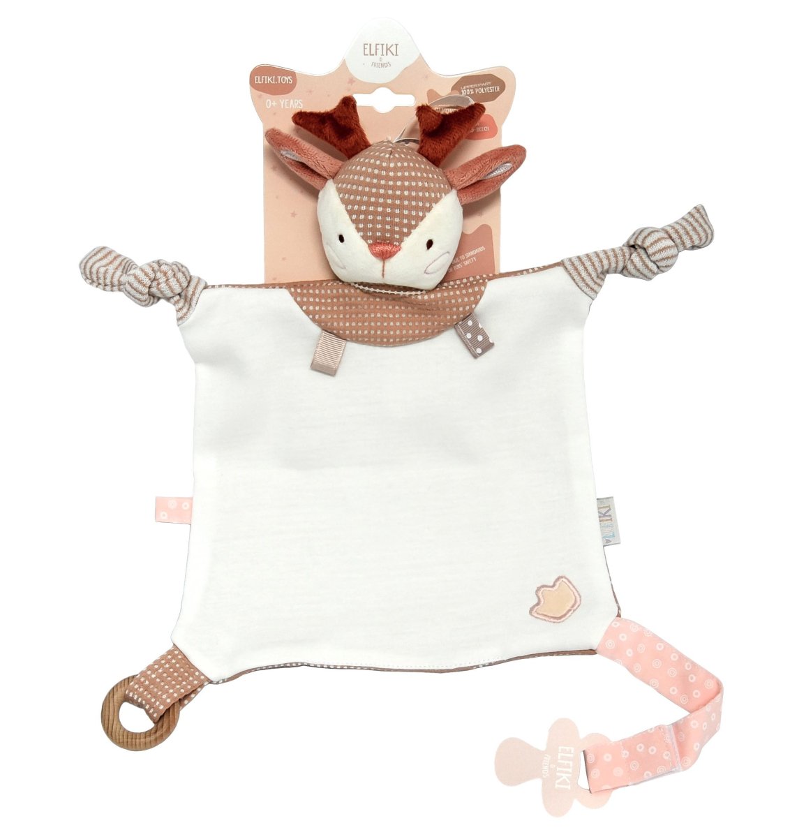 Zabawka – tekstylna sarna Ruby, ELFIKI – to zupełnie nowa seria ekologicznych zabawek wykonanych z wysokiej jakości, bezpiecznych dla zdrowia dzieci materiałów, które nie powodują alergii, są przyjemne w dotyku i dają ogromną przyjemność z przytulania. Tekstylna zabawka, nazywana również „pocieszycielką”, „ściskaczem”, „przytulanką”, przeznaczona jest dla niemowląt od urodzenia. To idealna zabawka do zasypiania, a także wielofunkcyjna zabawka do pierwszych zabaw dziecka, która zachęca do ruchu, przyczyniając się do rozwoju zmysłu dotyku i motoryki małej. Drewniany pierścień z wysokiej jakości drewna bukowego wygodnie leży w małym uchwycie, a jednocześnie doskonale spełnia funkcję gryzaka. Uchwyt na smoczek jest niezastąpiony w codziennej pielęgnacji dziecka. Przytulacz to idealna zabawka dla najmłodszych dzieci, której zaletą jest to, że tworzy sprzyjającą atmosferę do zasypiania noworodka. Zaleca się umieszczanie przytulaka w pobliżu dziecka, gdy zasypia, a także podczas karmienia. Materiał dobrze wchłania zapach mamy, a dziecko czuje się komfortowo w łóżeczku lub wózku, czując w pobliżu jej naturalny zapach. Wykonany jest z przyjemnego w dotyku materiału, dzięki czemu utrzymanie czystości nie sprawia trudności – łatwo go prać i suszyć. Zabawka jest całkowicie bezpieczna dla dzieci od 0. miesiąca życia. Dostępna w 5 wariantach: jelonek Ruby, elf Puffy, elf Ailey, sowa Mia i ptak Pipo. Zabawka – sarna Ruby – to idealny prezent dla noworodka na wypis, wizytę, chrzest!